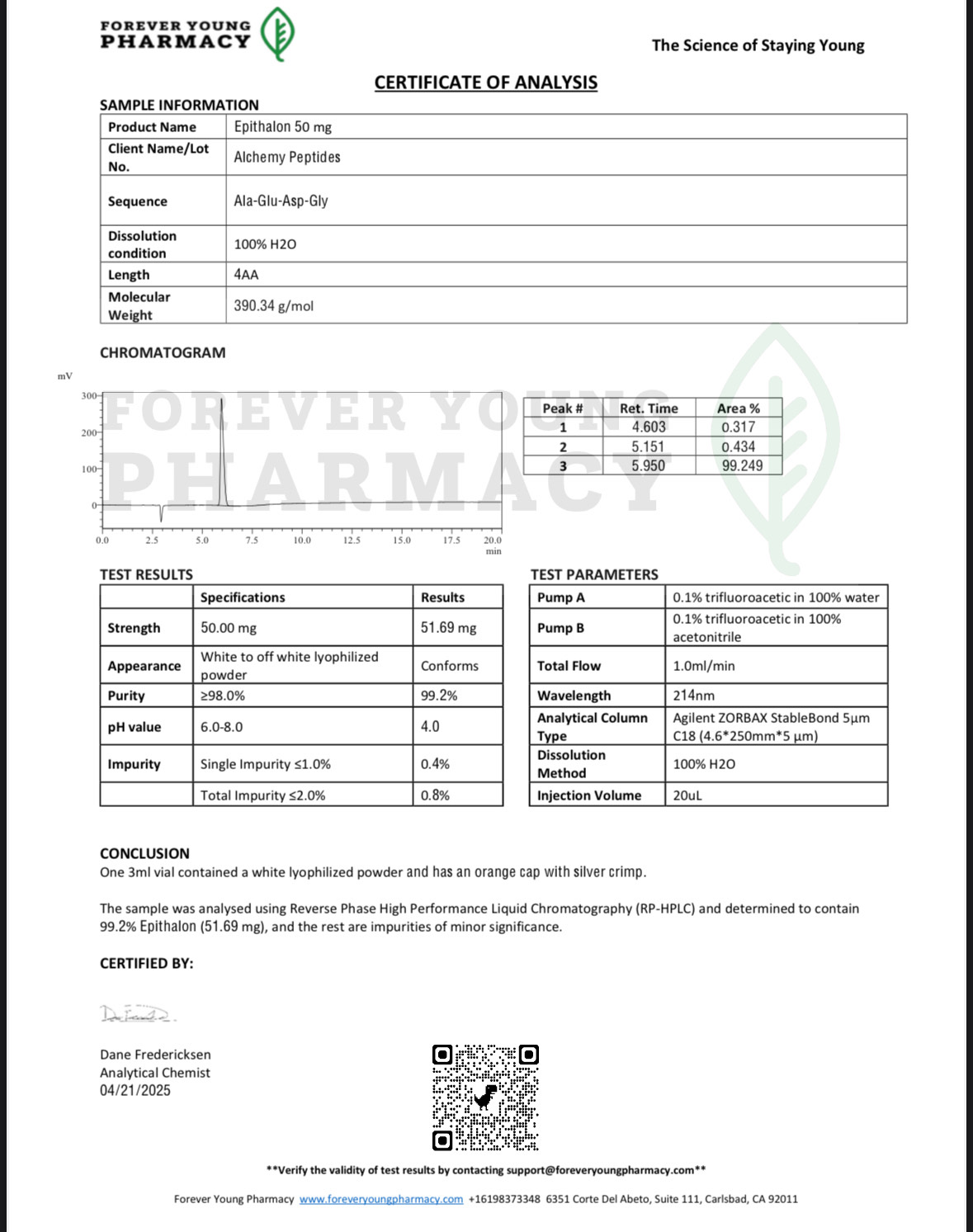 Epithalon is a synthetic tetrapeptide originally developed for scientific study of telomerase regulation and cellular mechanisms. Research has explored its potential involvement in telomere dynamics, melatonin secretion, and pathways linked to aging biology. Epithalon continues to be evaluated in experimental settings and is provided strictly for research purposes.