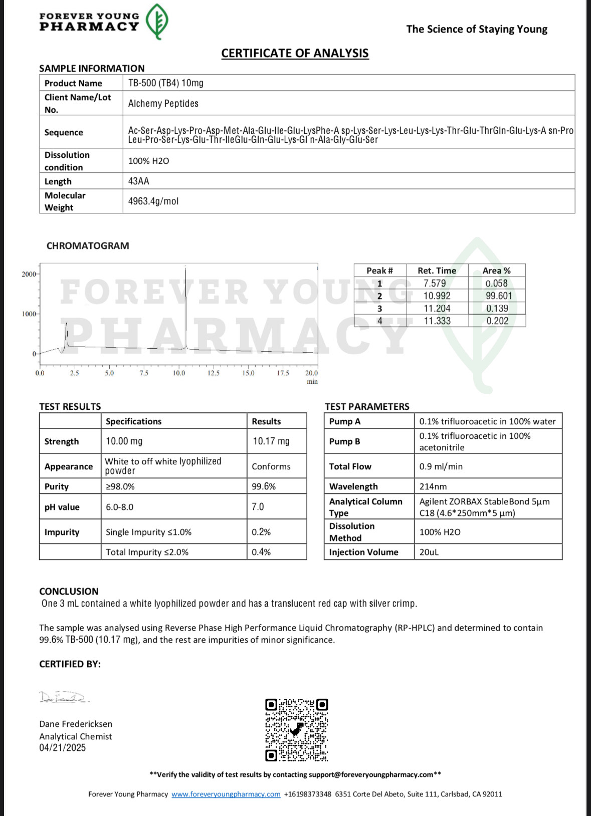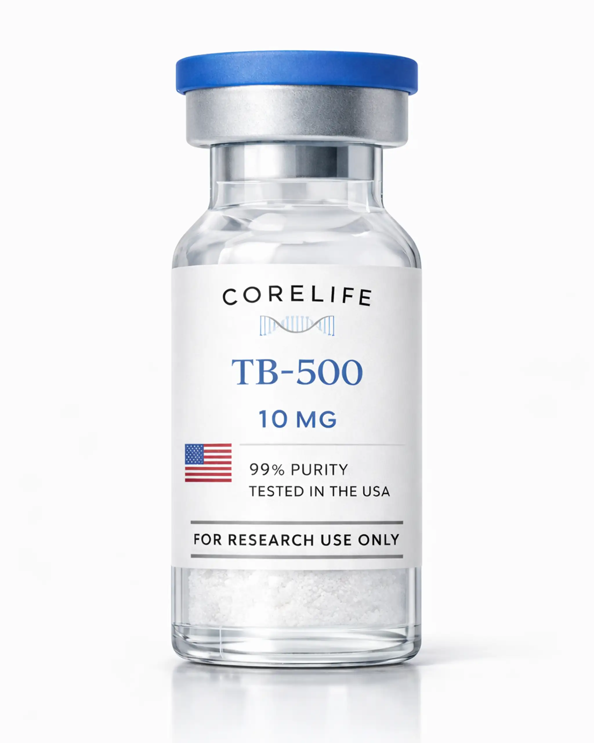 TB-500, a synthetic form of Thymosin Beta-4, is an amino acid peptide studied for its involvement in cellular structure and repair processes. Research explores its interaction with actin, as well as roles in tissue regeneration, inflammation control, and angiogenesis. TB-500 remains under investigation for laboratory research use only.